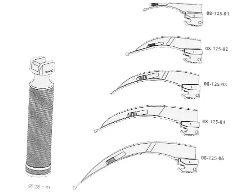 Mclntosh Laryngoscope, Set 4 blades with one battery handle in wooden case